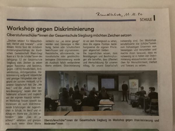 Die Integrationsagentur der Kurdische Gemeinschaft Rhein-Sieg/Bonn e.V. bietet im Rahmen seines Projektes „Zeichen setzen! Für Menschlichkeit, Vielfalt und Akzeptanz“auch in diesem Jahr weiterhin kostenlose Antidiskriminierungsworkshops an Schulen im Rhein-Sieg-Kreis an. In den Workshops werden die Themen Antidiskriminierung, Antirassismus, Antisemitismus und viele weiteren Diskriminierungsformen behandelt, um die Schüler*innenschaft zum Thema zu sensibilisieren und mögliche Vorurteile abzubauen und aufzuklären.