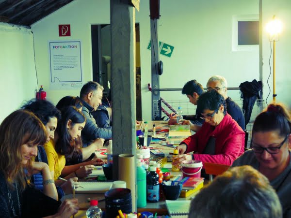 Hasan Hüseyin Deveci begleitete den ersten Workshop, indem er die Kunstbegeisterten ermutigte, frei und ohne Angst Ihre Sicht auf sich selbst und ihr Leben künstlerisch mithilfe der durch die Maltüte zur Verfügung gestellten Mittel zu gestalten. Zuvor hatte er mit einfühlsamen Worten in das Thema Heimat und Identität eingeführt.
