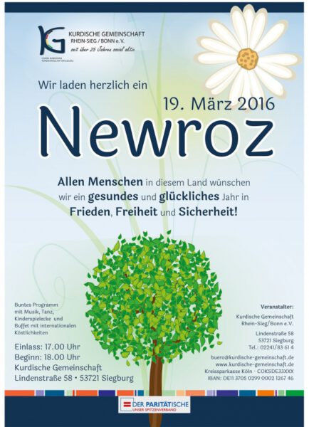 19. März 2016 (Einlass 17.oo Uhr) in den Räumlichkeiten der Kurdischen Gemeinschaft Rhein/Sieg-Bonn e.V., Lindenstraße 58, 53721 Siegburg bei Musik, Tanz, Theater und kurdischen Spezialitäten mit uns NEWROZ zu feiern.