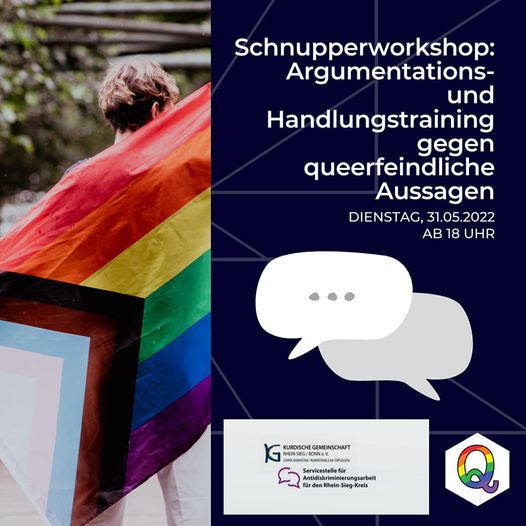 Wir möchten euch zu einem Schnupperworkshop zum Thema „Argumentations- und Handlungstraining gegen queerfeindliche Aussagen“ am 31.05.2022 ab 17:30 Uhr ins Q einladen (Hippolytusstraße 48, Troisdorf).
