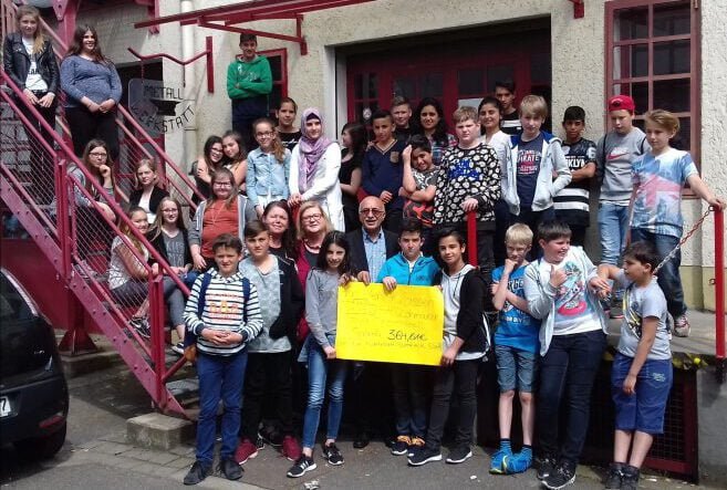 „Im Rahmen von Projekttagen der Gemeinschaftshauptschule Troisdorf an der Lohmarer Straße im März 2016, besuchten wir die Kurdische Gemeinschaft in Siegburg und informierten uns über deren Angebote und Hilfen speziell für Flüchtlinge. Wir, das sind die Kinder der Klassen 6a und 6b mit ihren Klassenlehrerinnen Frau Claudia Dorten und Frau Anita Wißborn sowie ihren Lehrerinnen Frau Simone Klaus und Frau Barbara Austen. Sehr interessiert hat uns der Präsentation von Frau Jinda Ataman am nächsten Tag. Frau Ataman berichtete mit eindrucksvollen Bildern über ihren drei monatigen Aufenthalt als Flüchtlingshelferin in einem Flüchtlingslager bei Dohuk in der autonomen Region Kurdistan (Nordirak). Sehr betroffen waren wir als Frau Ataman von fehlenden Schuhen und Handschuhen (im Winter) erzählte und dass sie mit Geldspenden aus dem Rhein-Sieg-Kreis direkt vor Ort helfen konnte. Spontan hatten wir die Idee auch dort zu helfen, Geld zu sammeln und zu spenden. Zu diesem Zweck wurde schnell ein Verkaufsstand in der Troisdorfer Fußgängerzone mit selbstgebackenen Kuchen, Imkerhonig (Spende Herr Trauth,Troisdorfer Imker) und hausgemachter Bio Marmelade (Spende Herr Brähm, Lehrer) organisiert. Bei eisiger Kälte, aber mit großer Begeisterung wurden die gespendeten Lebensmittel verkauft. Toll war auch, wie positiv viele Menschen auf unsere Aktion reagierten. In der Schule erwartete uns noch eine weitere Überraschung. Die Schülerinnen der Förderklasse 2 mit ihrem Klassenlehrer Herr Murat Kilic stockte den gesammelten Betrag von 300€ durch einen spontan an der Schule durchgeführten Kuchenverkauf auf 350€ auf. Diese Geldspende kommt nun den Familien aus den Camps in der autonomen Region Kurdistan zu Gute, wo Jinda Ataman und andere Vertreter der Kurdischen Gemeinschaft Rhein-Sieg/Bonn e.V Ende Mai wieder hin reisen. Wir freuen uns die Spende von 350€ an die Kurdischen Gemeinschaft Rhein-Sieg/ Bonn e.V. überreichen zu können und die Kinder in den Flüchtlingscamps mit unterstützen zu können.“