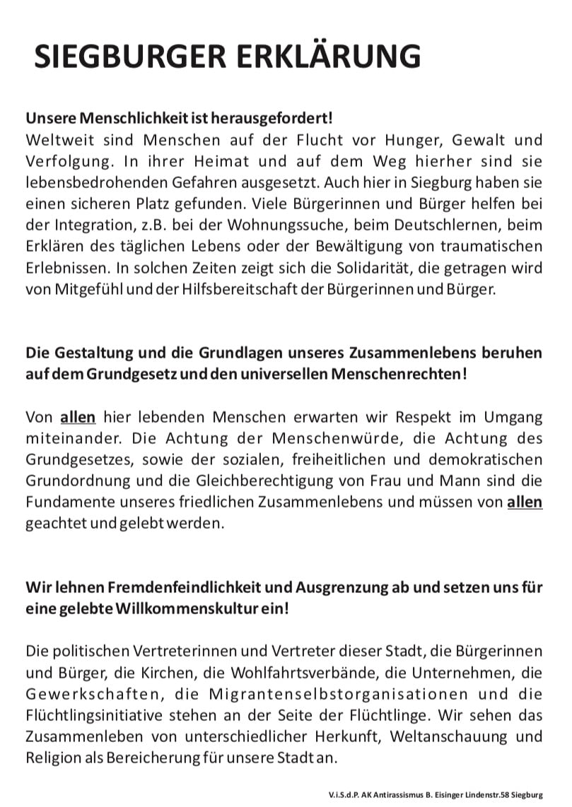 Die Siegburger Erklärung wurde im Jahr 2015 durch den Arbeitskreis Antirassismus in Siegburg und der Integrationsagentur der Kurdischen Gemeinschaft als eine bürgerschaftliche Willensbekundung ins Leben gerufen. Ziel der Initiator*innen und der Mitunterzeichner*innen war es entgegen einer Haltung von Ausgrenzung und Rassismus, ein Zeichen für Menschlichkeit und Toleranz zu setzen.