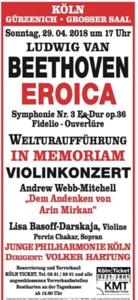 wir möchten Sie hiermit auf die Uraufführung des Violinkonzerts Arin Mirkan der Junge Philharmonie Köln, Dirigent Volker Hartung am Sonntag, 29.April 2018 um 17.00 Uhr aufmerksam machen.